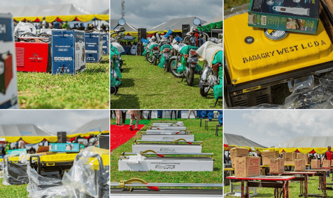 The event, themed “100 Days of Renewed Hope, Action, and Accountability,” saw the distribution of vital work tools and business-support equipment to artisans and small-scale entrepreneurs, as well as direct financial support to traders, widows, the elderly, and persons living with disabilities. Items provided included motorcycles (Okada), grinding machines, tiling tool sets, hair clippers with generator units, wheelchairs, welding machines, and other productivity-enhancing equipment designed to promote self-reliance and sustainable income generation.