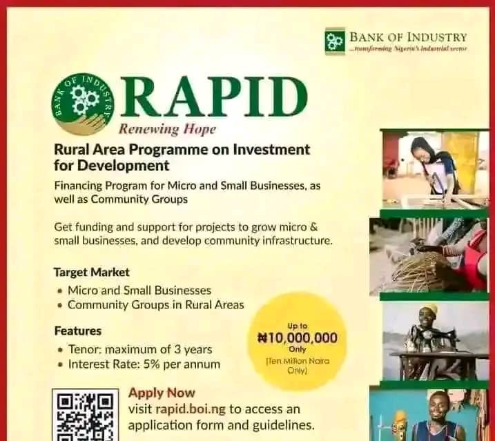 The Bank of Industry (BOI) invites applications for the Rural Area Programme on Investment for Development (RAPID), an initiative designed to empower micro and small businesses as well as community groups in Nigeria’s rural areas with funding and support to scale their operations and build sustainable community infrastructure.