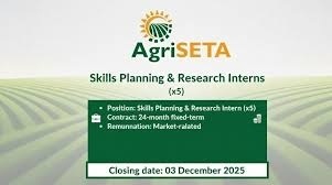 AgriSETA is offering five internship opportunities for 2026 within its Skills Planning and Research Division, giving qualified youth a chance to gain hands-on experience in data work, reporting and administrative support in the agricultural sector. The twenty-four–month programme is structured for graduates who are detail-oriented, analytical and comfortable working with data, especially those hoping to build a career within a SETA environment while contributing to national skills development efforts.