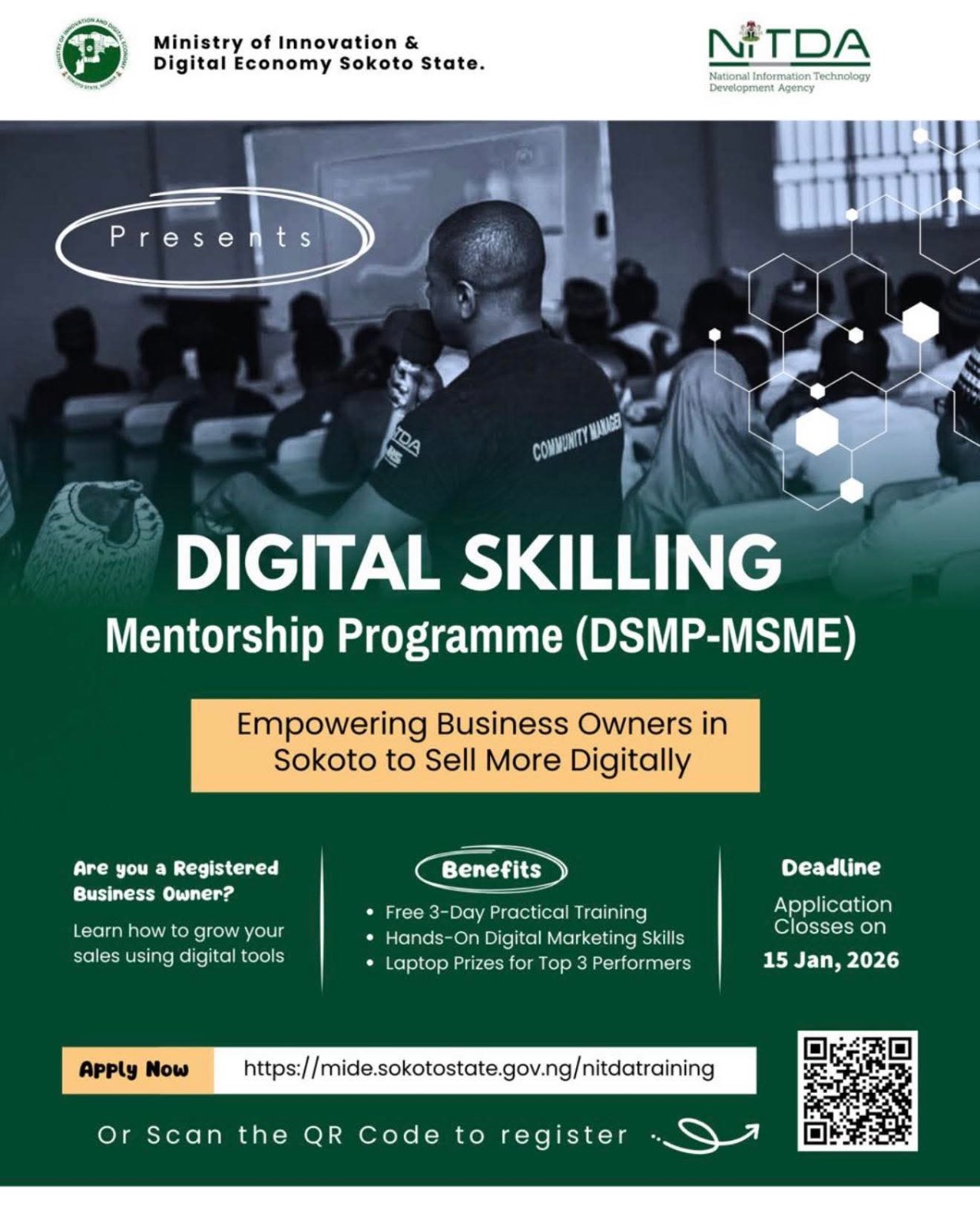 The Ministry of Innovation and Digital Economy Sokoto under the leadership of Hon. Bashar Umar Kwabo, in collaboration with the National Information Technology Development Agency (NITDA), invites eligible Micro, Small and Medium Enterprises (MSMEs) to apply for the Digital Skilling Mentorship Programme (DSMP-MSME) under the Federal Government’s Digital Literacy for All (DL4ALL) initiative.