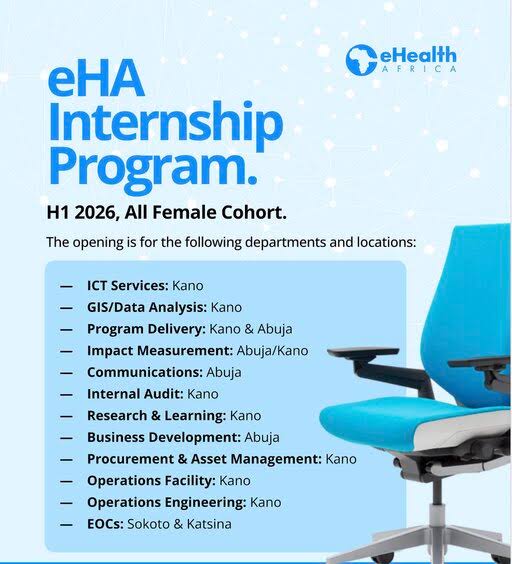 eHealth Africa (eHA) has opened applications for its first-ever All-Female Internship Program for the first half of 2026. This unique initiative is designed to equip young women with practical skills, professional experience, and leadership training to help them excel in global health and technology.