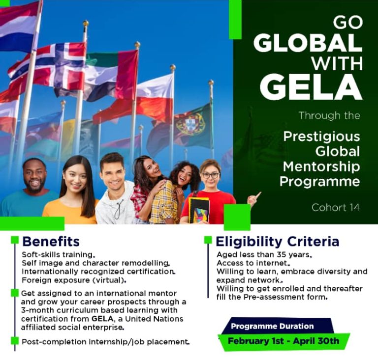 If you’re a young professional or graduate looking to build leadership skills, global networks, and career visibility, GELA’s 2026 “Prestigious Global Mentorship Programme (PGMP)” could be a fit. The programme aims to mentor, train and connect young people (especially from underrepresented or disadvantaged backgrounds) with global mentors — helping participants grow personally and professionally while gaining exposure to global perspectives and opportunities.