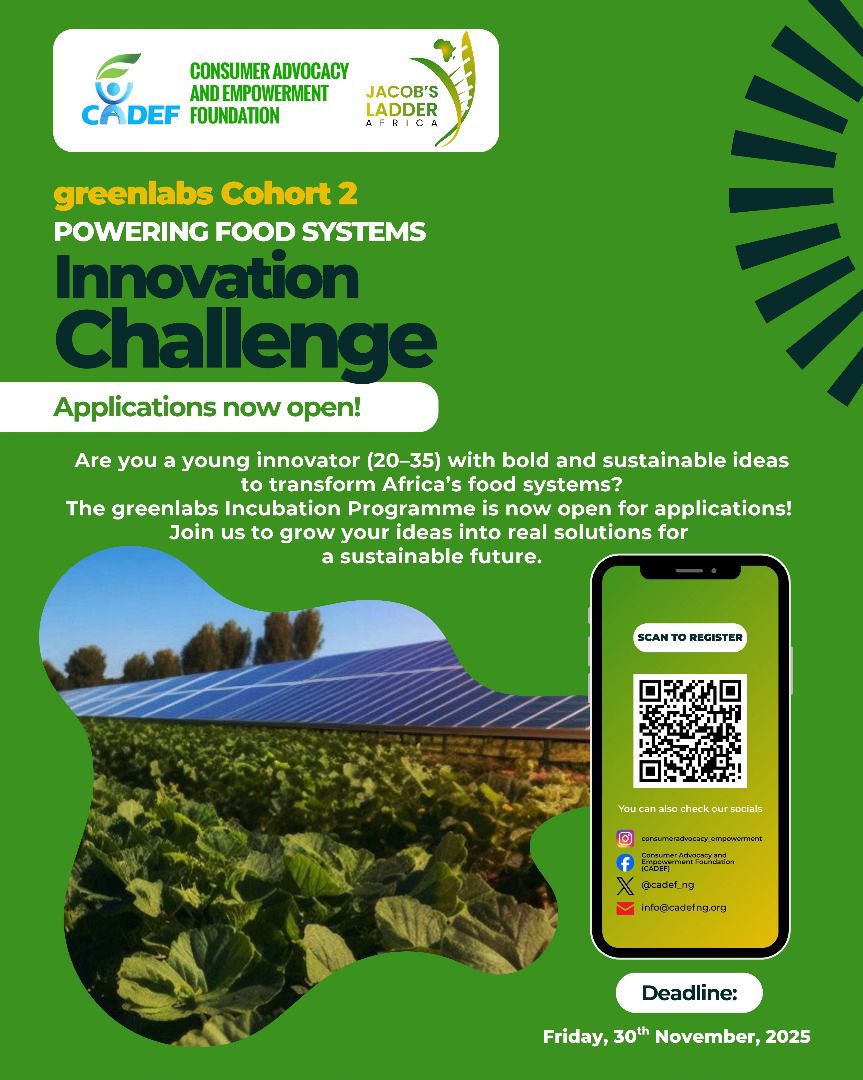 The Consumer Advocacy and Empowerment Foundation (CADEF), in partnership with Jacob’s Ladder Africa (JLA), has opened applications for Cohort 2 of the Greenlabs Incubation Programme, following the successful graduation of its first cohort.