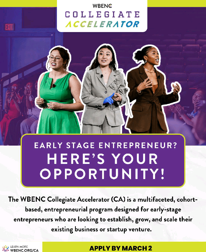 Applications are now open for the 2026 WBENC Collegiate Accelerator (CA), a competitive, cohort-based entrepreneurship program designed to support early-stage student founders and recent graduates who are building and scaling innovative business ventures.