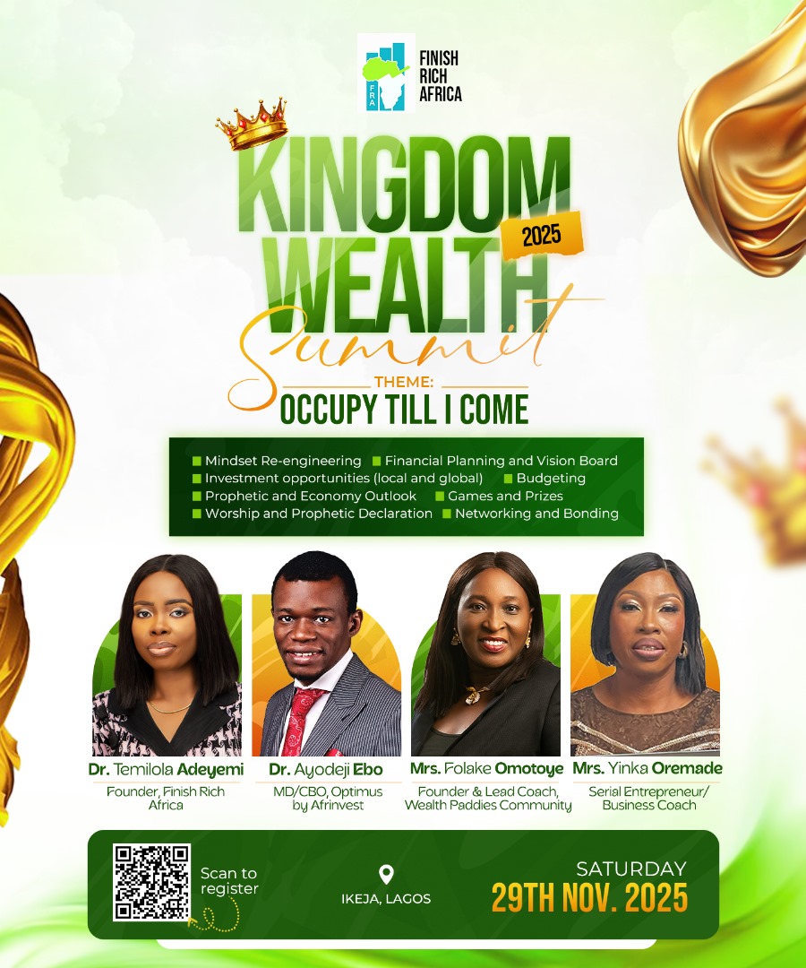 Finish Rich Africa presents the Kingdom Wealth Summit 2025, a power-packed, faith-driven event designed to equip Africans Business Owners with practical financial strategies, investment insights, and entrepreneurial tools rooted in kingdom principles.