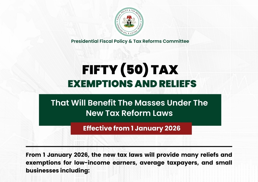 Nigeria will introduce 50 tax exemptions and reliefs from January 1, 2026, to support low-income earners, average taxpayers, startups, and small businesses. The plan, announced by the Presidential Fiscal Policy and Tax Reforms Committee, focuses on reducing tax pressure, boosting business growth, and improving fairness in the Nigerian tax system.