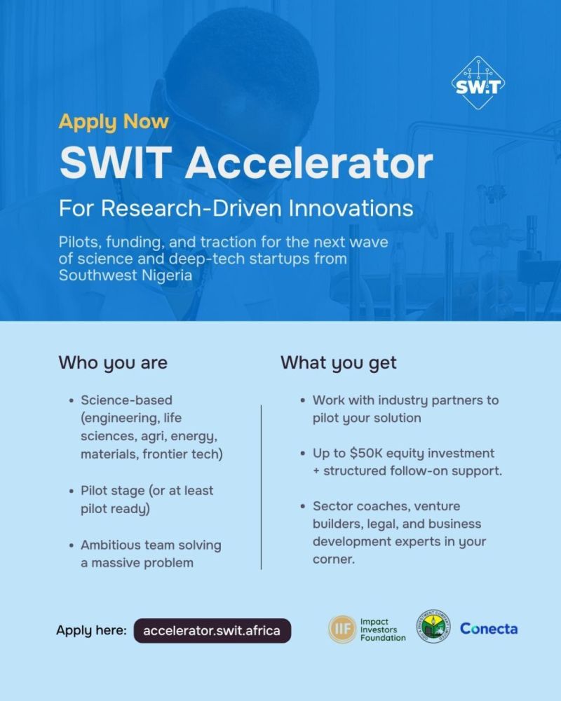 SWIT is the regional innovation arm of Odu’a Investment Company, focused on driving tech and socio-economic transformation in South-West Nigeria. It supports research-based ventures, deep tech, clean tech, and other high impact startups through acceleration, commercialization of research, strategic investment, and ecosystem building.
